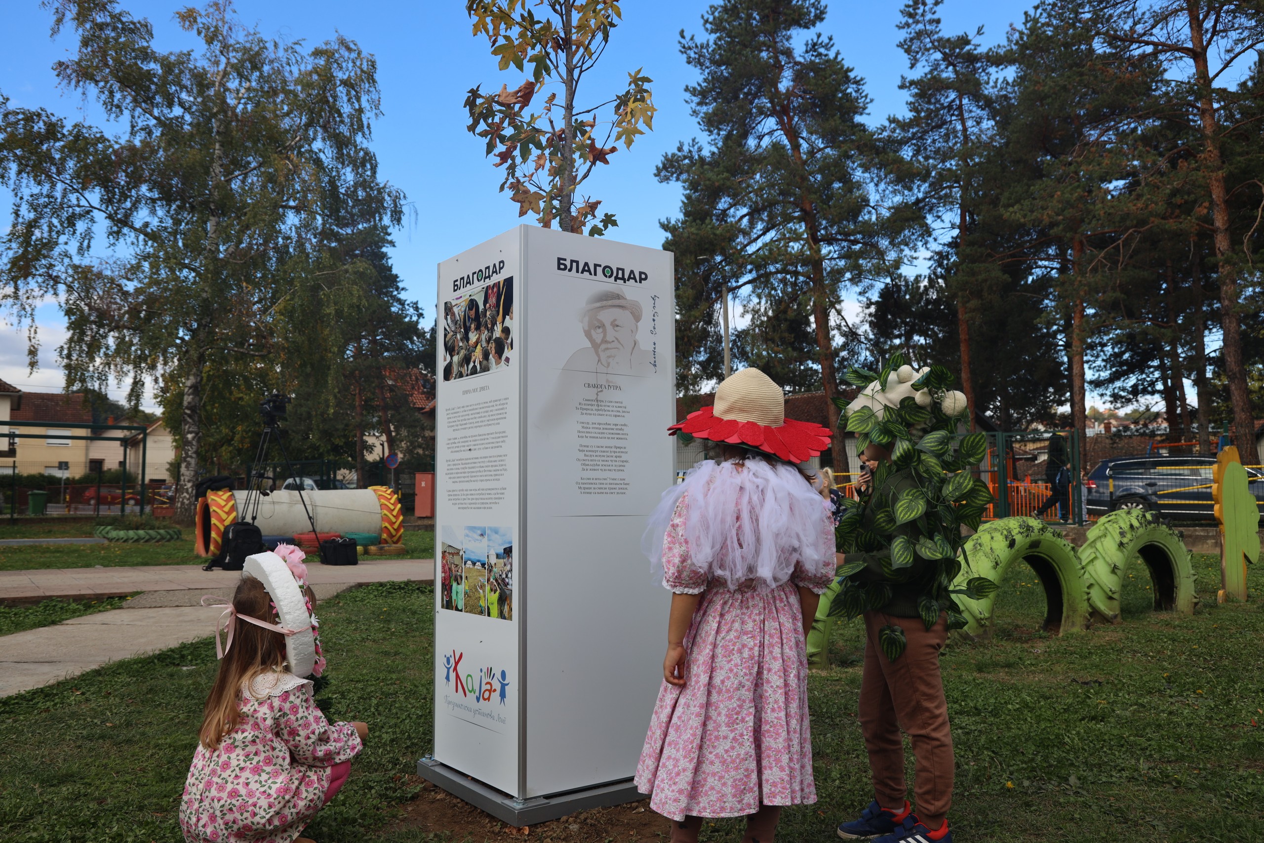Na konstrukciji postavljenoj uz drvo nalaze se ispisani delovi koji prate i upotpunjuju ovu simboličnu sadnju. Kroz tekstove pesme, istorijat ustanove i priču o drvetu, posetioci mogu da se upoznaju sa dubljim značenjem ove ideje- spoj prirode, tradicije i dečije mašte.